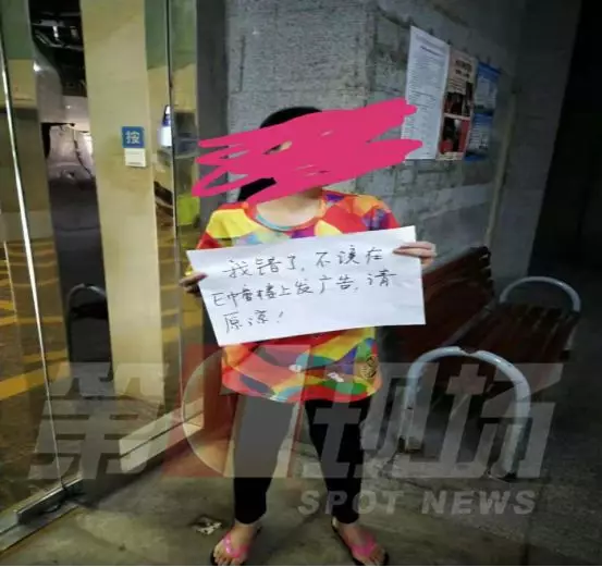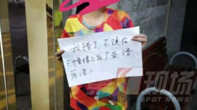 ▲女子手持道歉牌,上面寫著:“我錯了,不應(yīng)該在E棟樓上發(fā)廣告,請原諒”