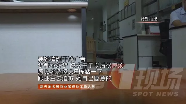 當(dāng)時這名女子在小區(qū)E棟樓層里張貼小廣告,物業(yè)發(fā)現(xiàn)后把她帶到管理處,要求她自行清理掉自己張貼的所有廣告,或者道歉,二者選其一。