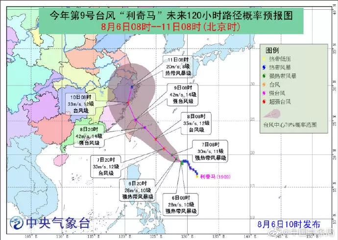 預(yù)計,“利奇馬”將以每小時5公里左右的速度緩慢向西北方向移動,強(qiáng)度逐漸增強(qiáng),最強(qiáng)可達(dá)臺風(fēng)級或強(qiáng)臺風(fēng)級(12-14級,35-45米/秒),逐漸向我國東南沿??拷?。未來兩天對我國近海海域無影響。
