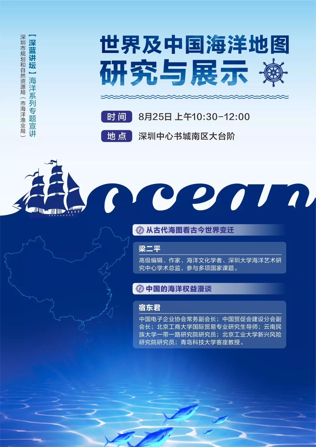 麥哲倫完成了第一次環(huán)球航行、哥倫布發(fā)現(xiàn)了新大陸、迪亞士最早探險(xiǎn)至非洲最南端好望角、達(dá)伽馬開(kāi)辟了通往印度的新航線…… 2000多年前,在茫茫大海上 裝備簡(jiǎn)陋的航海者 取暖靠抖、通訊靠吼 沒(méi)有網(wǎng)絡(luò)、沒(méi)有手機(jī)、沒(méi)有GPS …… 卻能在廣闊無(wú)邊的大海中 找到心之所向的目的地 這是因?yàn)?/p> 他們有一張神奇的圖——海圖 梁二平:從古代海圖看古今世界變遷 世界上這一次又一次的航海大發(fā)現(xiàn),或者是由黃金、白銀、香料、瓷器、黑奴貿(mào)易等所引發(fā)的大侵略、大移民、大變革,都在一張小小的圖中展現(xiàn)得淋漓盡致。 大航海時(shí)代早期,西班牙、葡萄牙稱(chēng)霸海洋,出盡了風(fēng)頭,靠的就是海圖。后來(lái)英國(guó)擊敗荷蘭,意識(shí)到光靠戰(zhàn)爭(zhēng)是控制不了海洋的,更重要的是海洋知識(shí)。于是,英國(guó)設(shè)立了一個(gè)水文部,專(zhuān)門(mén)進(jìn)行測(cè)量和制作海圖。這便是一代“海上霸主”崛起的關(guān)鍵。 每一幅海圖 都承載著豐富的地理、社會(huì)及歷史信息 不同時(shí)代、地域,不同文化背景下的海圖繪制者 對(duì)空間有著不同的理解 描繪世界的方式也有所不同 海圖一步一步從文字描述到精確標(biāo)注 東西方海圖相互交融發(fā)展 為海洋變遷提供了真實(shí)的見(jiàn)證 一張小小的海圖 卻扮演著舉足輕重的“角色” 其實(shí),它也和海洋權(quán)益 也有著密不可分的關(guān)系 宿東君:中國(guó)的海洋權(quán)益漫談 談及主權(quán)問(wèn)題 我們總是滿(mǎn)懷著一腔熱血 看紀(jì)錄片時(shí) 海上時(shí)不時(shí)會(huì)漂浮著一個(gè)個(gè)小浮標(biāo) 想知道小浮標(biāo)對(duì)海洋科技考察有什么作用? 中國(guó)先驅(qū)又是如何歷盡艱難險(xiǎn)阻 主張屬于中國(guó)的海洋權(quán)益的? 想知道引發(fā) 南海問(wèn)題、釣魚(yú)島問(wèn)題的“來(lái)龍去脈”嗎? 以上的種種疑問(wèn) 都將在8月25日的“”深藍(lán)講壇” 一同為你揭曉! “深藍(lán)講壇” 2017年5月,《全國(guó)海洋經(jīng)濟(jì)發(fā)展“十三五”規(guī)劃》明確提出推進(jìn)深圳建設(shè)全球海洋中心城市,在投融資、服務(wù)貿(mào)易、商務(wù)旅游等方面進(jìn)一步提升對(duì)外開(kāi)放水平和國(guó)際影響力,打造成為“21世紀(jì)海上絲綢之路”的排頭兵和主力軍;2018年9月,市委市政府印發(fā)《關(guān)于勇當(dāng)海洋強(qiáng)國(guó)尖兵加快建設(shè)全球海洋中心城市的決定》及實(shí)施方案;2019年,深圳創(chuàng)建全球海洋中心城市納入到《粵港澳大灣區(qū)規(guī)劃發(fā)展綱要》和《關(guān)于支持深圳建設(shè)中國(guó)特色社會(huì)主義先行示范區(qū)的意見(jiàn)》。 為讓社會(huì)了解這一重要政策,計(jì)劃通過(guò)開(kāi)展“深藍(lán)講壇”專(zhuān)題系列活動(dòng),通過(guò)專(zhuān)家講授、市民互動(dòng)等活動(dòng),請(qǐng)市民對(duì)我市海洋發(fā)展政策、主要目標(biāo)和實(shí)施路徑等建言獻(xiàn)策,在擴(kuò)大影響面的同時(shí)收集好的意見(jiàn)和建議,以更好地推動(dòng)我市海洋各項(xiàng)工作的順利開(kāi)展,為我市創(chuàng)建全球海洋中心城市營(yíng)造氛圍,奠定思想基礎(chǔ)。 現(xiàn)在,“深藍(lán)講壇”專(zhuān)題系列活動(dòng)真的來(lái)了! 8月25日 以“世界及中國(guó)海洋地圖研究與展示”為主題 2019年首場(chǎng)“深藍(lán)講壇”海洋系列專(zhuān)題宣講活動(dòng) 即將拉開(kāi)帷幕