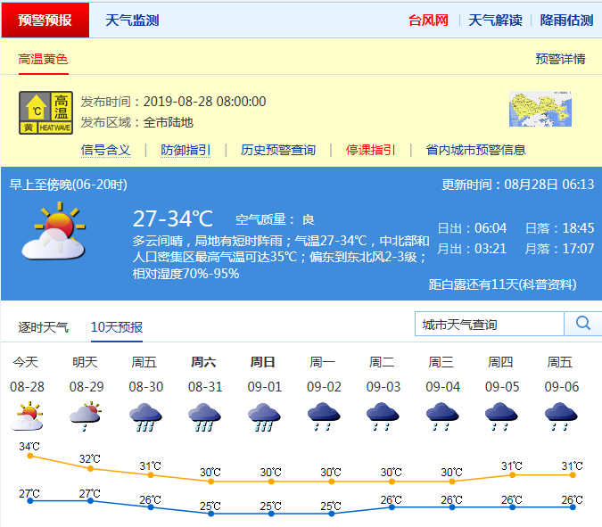 據(jù)市氣象局預(yù)計(jì),我市28-29日炎熱加劇,午后局部有熱雷雨,最高氣溫34-36℃;30日至9月1日有一次大雨局部暴雨降雨過程,最大陣風(fēng)6-7級,悶熱緩解。市氣象局提醒市民,臺風(fēng)“楊柳”進(jìn)入南海后,其路徑強(qiáng)度預(yù)報(bào)尚有不確定性,請市民關(guān)注市氣象臺發(fā)布的最新預(yù)報(bào)預(yù)警信息。