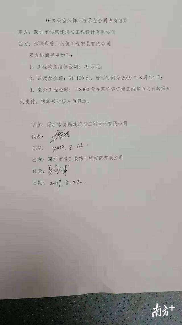 南方網(wǎng)2019年8月28日訊 去年11月,田先生承包下福田卓越城一期O+智慧平臺的室內(nèi)裝修工程。工程完工至今近半年,卻一直沒收到總包方深圳市協(xié)鵬建筑與工程設(shè)計有限公司(以下稱協(xié)鵬建筑)的余款共計84余萬元,臨近開學(xué),工人們都急著交學(xué)費(fèi),公司也無法正常運(yùn)營。