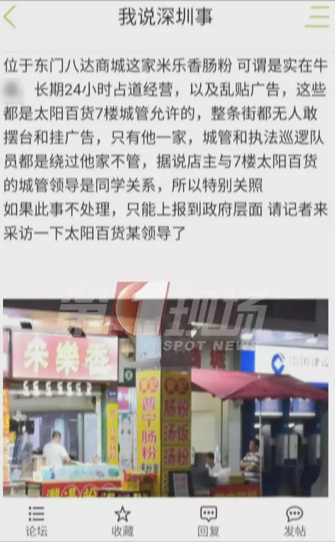 昨天,論壇上的一則帖子引起網(wǎng)友圍觀,帖子提到位于東門八達(dá)商城的米樂(lè)腸粉店,24小時(shí)占道經(jīng)營(yíng),亂貼廣告。整條街都不敢這么做,唯獨(dú)這家沒(méi)有城管管理,原因是店主跟7樓太陽(yáng)百貨的城管領(lǐng)導(dǎo)是同學(xué)。