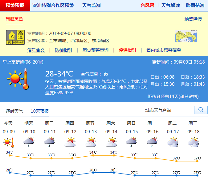見圳客戶端·深圳新聞網(wǎng)2019年9月9日訊 深圳市氣象局官方微博消息,這周天氣炎熱伴有雷陣雨:周一多云,有短時(shí)雷陣雨,氣溫28-34℃;周二到周三日多云,有(雷)陣雨;周四到周六天氣晴熱,午后有熱雷雨。高溫黃色預(yù)警信號(hào)生效中,請注意防暑降溫及午后熱雷雨。