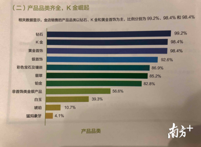 從消費品類而言,黃金購買量最大,占比64.3%;K金材質產品,占比29.7%;第三是鉑金,占比28.1%;第四是鉆石及鉆石鑲嵌類、白銀制品,占比分別是19.4%和18.3%;彩寶及玉石鑲嵌類的消費占比為16.3%;珍珠及包裹金制品約為10%和7.9%。而且,戒指與相連需求最高。