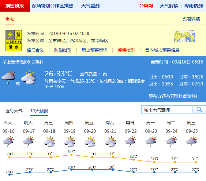 見(jiàn)圳客戶(hù)端·深圳新聞網(wǎng)2019年9月16日訊 深圳市氣象臺(tái)預(yù)計(jì),周一我市多云,有短時(shí)(雷)陣雨,部分時(shí)間雨勢(shì)稍大,氣溫26-33℃;周二至周日多云到晴天,天氣趨于悶熱,午后局地有短時(shí)陣雨。