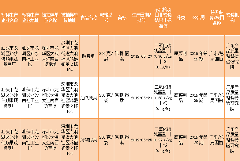 龍華大浪大江南百貨商場賣的酸豆角、汕頭咸菜和澄海酸菜因二氧化硫殘留量超標(biāo)上黑榜了