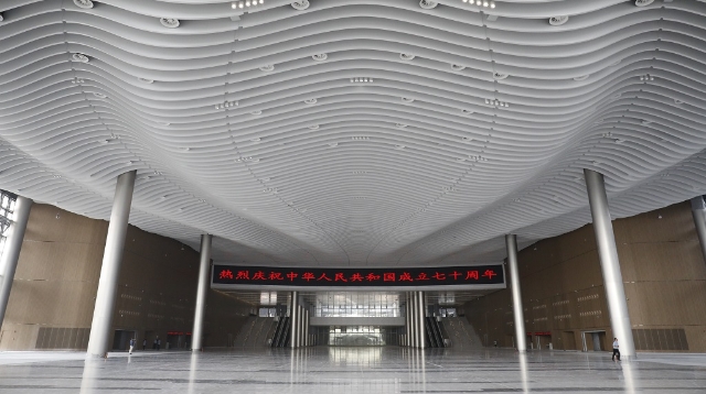 中央廊道和展廳之上,則是擁有超高顏值、可覆蓋106個標準足球場的金屬屋頂。如何讓平淡無奇的屋頂變得漂亮?設(shè)計方介紹,團隊曾經(jīng)嘗試過云海、絲帶、花瓣等多種元素,經(jīng)過多次討論最終確定以海浪為原型,屋面呈現(xiàn)彩色絲帶花紋,寓意“海上絲綢之路”。屋頂?shù)氖┕ね瑯泳媲缶?,在施工過程中,工人通過航拍圖對比效果圖,錯了一塊裝飾板都要更換。