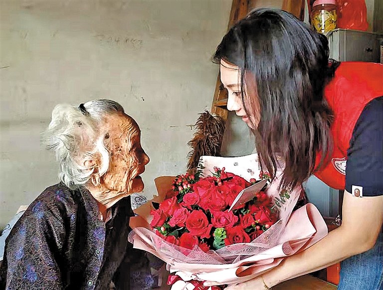 9月底,陽光明媚的上午,101歲的陳汝金像往常一樣坐在家里,陽光照進屋子,照在她的臉上,一切顯得平靜安詳。福永街道鳳凰社區(qū)工作站的工作人員帶著鮮花和水果,和記者一起來到老人家里。這一天,老人的外孫女文小姐和孫媳婦也正好回來看望她。