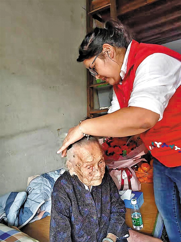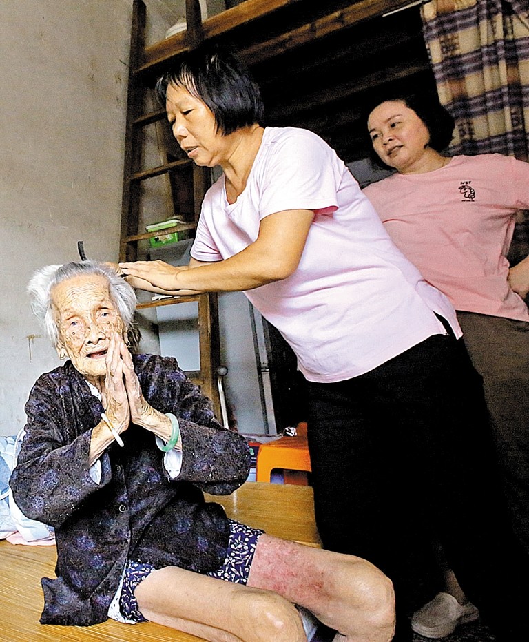 陳汝金老人喜歡打本地花牌,打到了99歲,后來腰部退化,不能久坐,她才沒有再打花牌。吃飯方面,陳汝金也有自己的主張,不求好不求貴,簡簡單單活到老,“外婆以前是生產(chǎn)隊的炊事員,直到去年她還能自己做飯呢?!痹谖男〗憧磥?,如此長壽的外婆也沒有特別的養(yǎng)生之道,“保持好心態(tài),順其自然就是最長壽的秘方?!?/p>