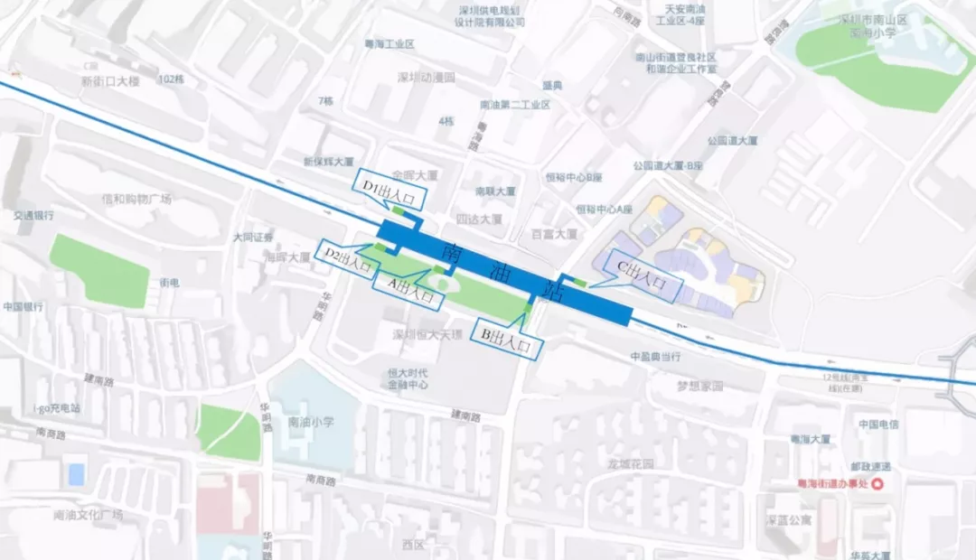 9號線二期南油站位于南山區(qū)南海大道與登良路交叉口下方,沿南海大道呈南北向敷設,為地下2層車站,地下一層為站廳層,地下二層為站臺層,車站總長334m,車站出入口共計5個A出入口、B出入口、C出入口、D1出入口、D2出入口。B出入口位于恒大天璟北側,C出入口位于來福士廣場一側登良路與南海大道交匯處,D1出入口位于金暉大廈東側,A、D2出入口位于南海大道與華明路交匯處。