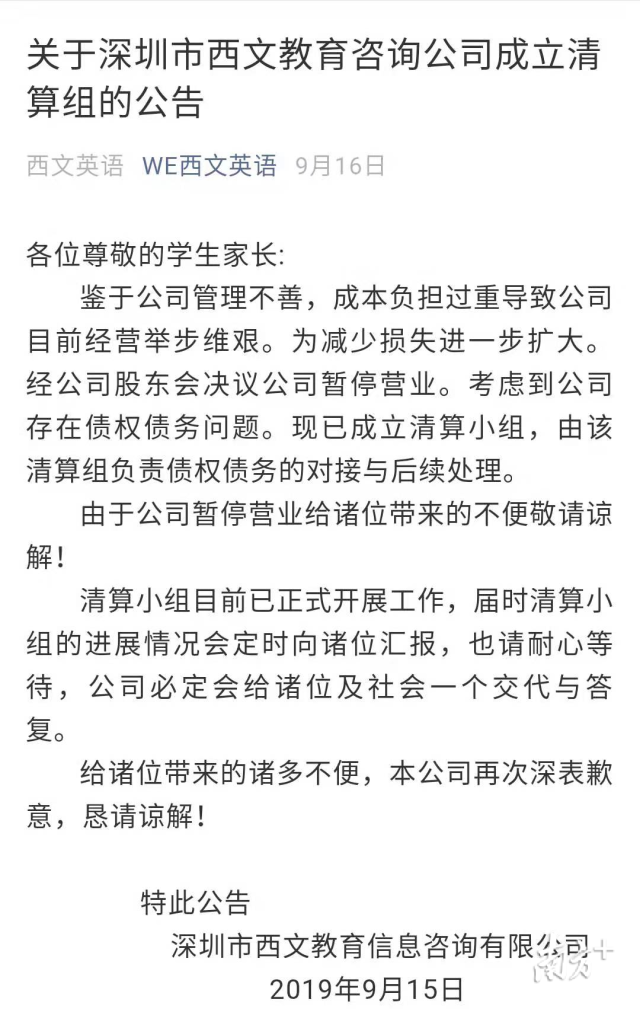 “9月9日時(shí),西文英語還在正常營(yíng)業(yè),當(dāng)天還收了幾十個(gè)學(xué)員的學(xué)費(fèi)。但第二天就關(guān)門了,貼著告示說暫停營(yíng)業(yè),毫無預(yù)兆?!标愊壬f。