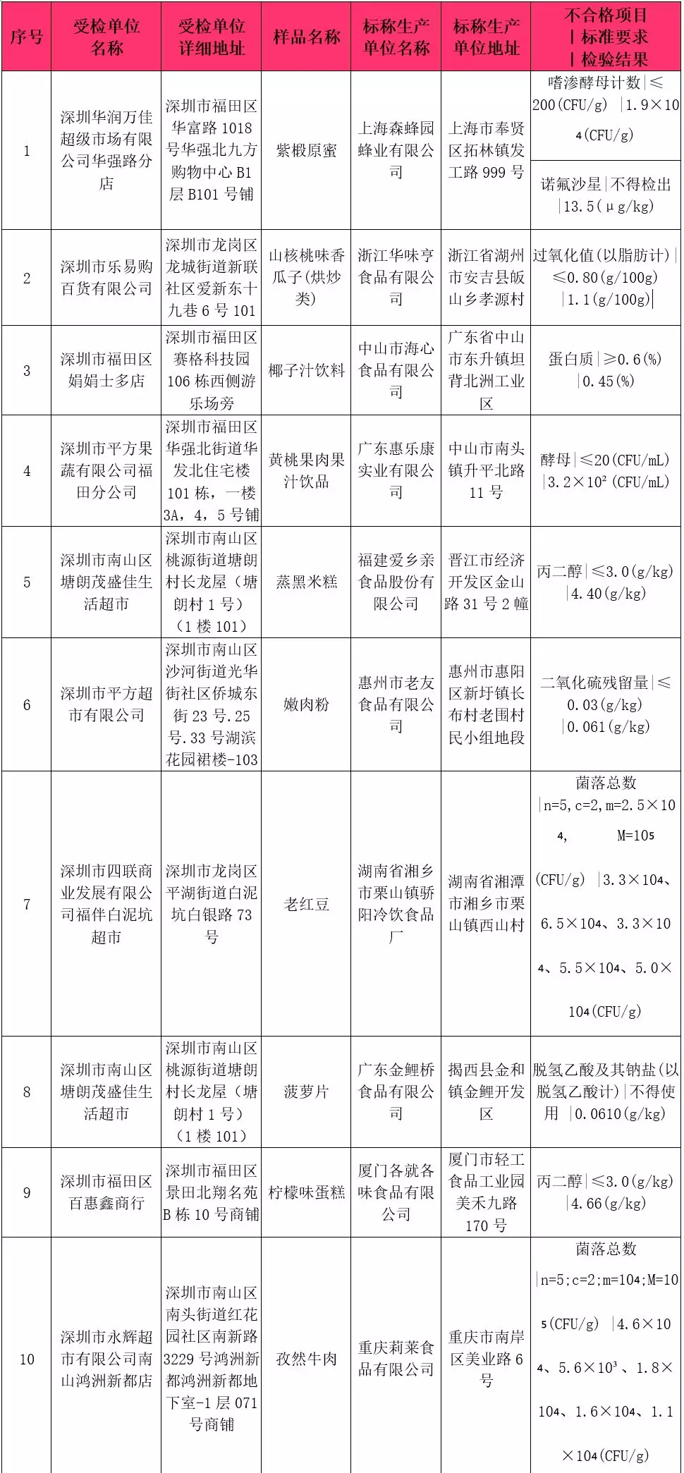 本次共抽檢流通環(huán)節(jié)食品918批次,涉及流通環(huán)節(jié)經(jīng)營主體230家次,共檢測食品指標(biāo)5434項(xiàng)次。其中檢出不合格樣品10批次,涉及不合格食品類別有炒貨食品及堅(jiān)果制品1批次,淀粉及淀粉制品1批次,蜂產(chǎn)品1批次,糕點(diǎn)2批次,冷凍飲品1批次,肉制品1批次,水果制品1批次,飲料2批次;涉及不合格項(xiàng)目類別為獸藥殘留、品質(zhì)指標(biāo)、微生物污染、食品添加劑。
