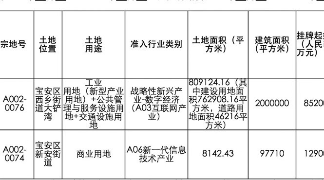 根據(jù)公告,深圳市土地房產交易中心受深圳市規(guī)劃和自然資源局寶安管理局委托,擬出讓寶安區(qū)西鄉(xiāng)街道大鏟灣A002-0076和寶安區(qū)新安街道A002-0074兩宗地。掛牌期自2019年11月20日至2019年11月29日15時止。(見圖表)