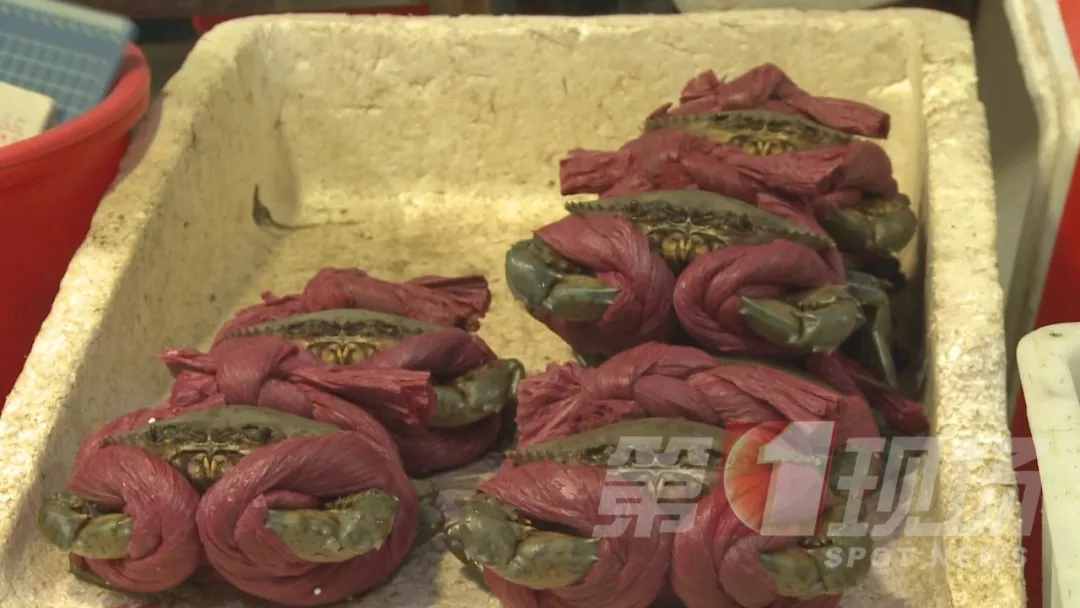 ▲粗大的紅色綁蟹繩,吸水后重半斤,這樣的膏蟹商家賣(mài)85元/斤。