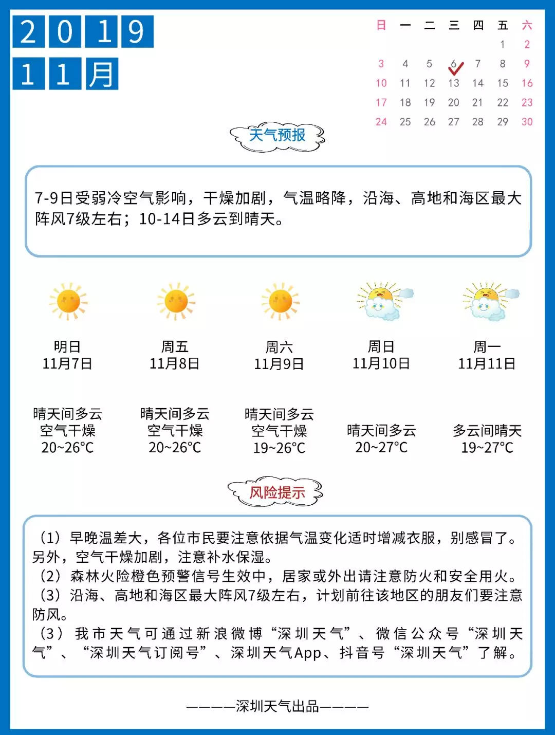 見圳客戶端·深圳新聞網(wǎng)2019年11月7日訊 空氣非常干燥,沿海及高地陣風7級左右,氣溫20-26℃。未來幾天干燥加劇,請注意用火安全,戶外運動需及時補充水分。