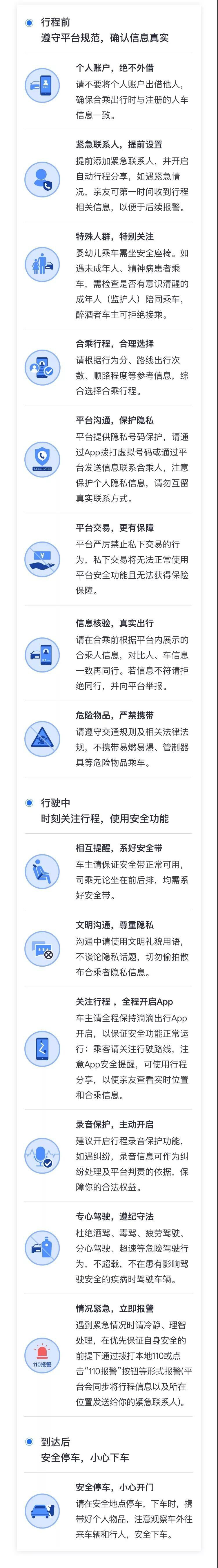 新方案顯示,試運營期間,將在以上7個城市首先提供5:00~23:00(女性5:00~20:00)、市內中短途(50公里以內)的順風車平臺服務。試運營期間,不收取信息服務費。
