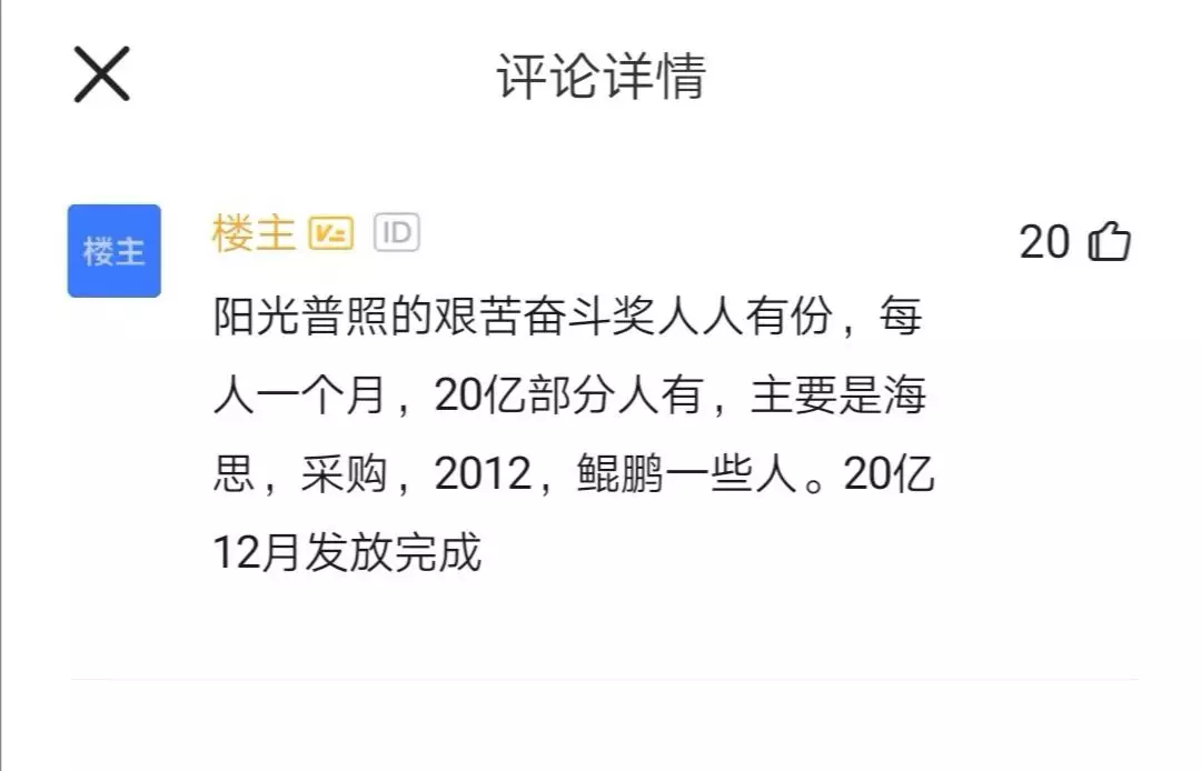 有華為員工在職場社交平臺稱,“陽光普照的艱苦奮斗獎人人有份,20億部分人有,主要是海思、采購、2012、鯤鵬一些人?!?/p>