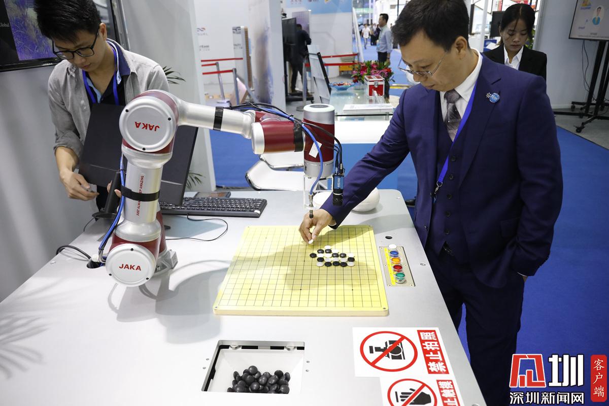 一位正在與協(xié)作機(jī)器人下棋的男士,協(xié)作機(jī)器人主要依靠視覺(jué)進(jìn)行反應(yīng)。