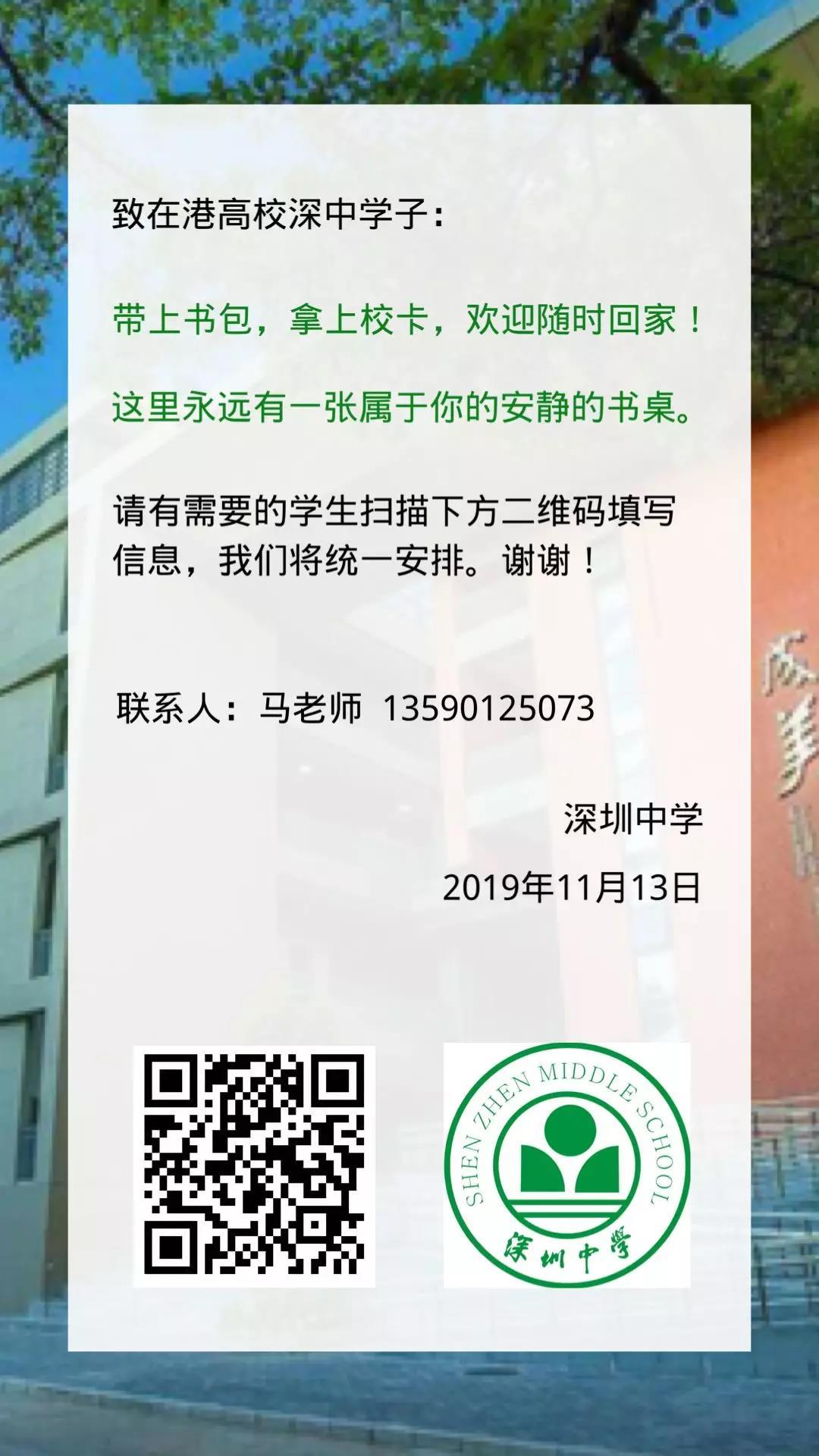 見圳客戶端·深圳新聞網(wǎng)2019年11月14日訊 繼香港中文大學(xué)(深圳)發(fā)文表示為內(nèi)地在港就讀學(xué)生提供臨時免費住宿后,深圳中學(xué)今天也在官方微信公號中致信在港高校深中學(xué)子,只要拿上校園卡,深中隨時歡迎學(xué)子們回家!學(xué)校將對有需要的學(xué)生統(tǒng)一進行安排。