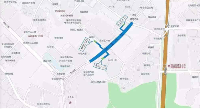 南油站位于南山區(qū)南海大道與登良路交叉口下方,車站出入口共計5個,B出入口位于恒大天璟北側(cè),C出入口位于來福士廣場一側(cè)登良路與南海大道交匯處,D1出入口位于金暉大廈東側(cè),A、D2出入口位于南海大道與華明路交匯處