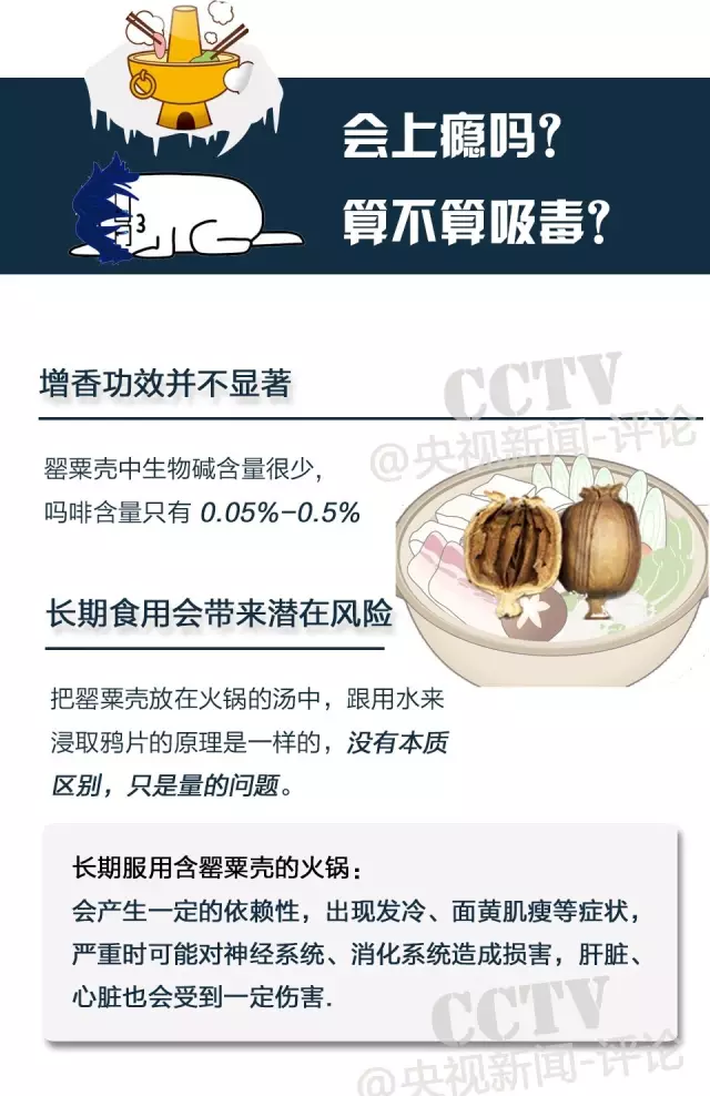 初次食用加入了罌粟殼的火鍋或小吃后,一般有心跳加快、臉色微紅、不易入睡等感覺(jué),這種情況因個(gè)體差異及火鍋中罌粟殼含量而有所不同。
