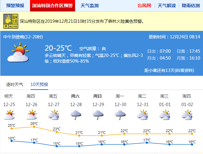 見(jiàn)圳客戶端·深圳新聞網(wǎng)2019年12月24日訊 今日多云,可見(jiàn)陽(yáng)光,有輕霧或霾;氣溫20-25℃;東風(fēng)2-3級(jí);相對(duì)濕度55%-90%;25-26日多云,有輕霧或霾,白天溫暖;26日夜間至27日冷空氣影響,風(fēng)力加大,沿海、高地和海區(qū)最大陣風(fēng)7級(jí)左右,氣溫下降,天氣轉(zhuǎn)涼;28-30日云量增多,有一次降水過(guò)程。