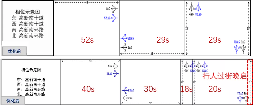 拆分北進(jìn)口機(jī)動(dòng)車(chē)時(shí)間,行人晚啟,以減少北進(jìn)口左轉(zhuǎn)機(jī)動(dòng)車(chē)與南面出口側(cè)行人交織。