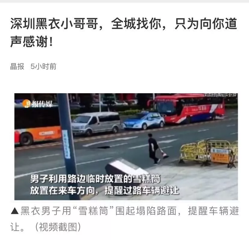 5月16日傍晚時分,一名身穿黑衣的青年男子經過南山海德一路和后海濱路交匯處時發(fā)現路面有塌陷并出現不小的洞口,車輛擦邊迅疾而過險象環(huán)生,于是從路邊找來若干雪糕筒擺在洞口來車方向提醒司機繞洞而行,從而避免了交通事故的發(fā)生。