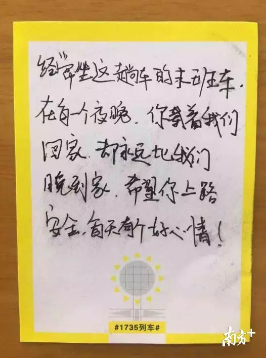 紙條上寫著:“經常坐這趟車的末班車,在每個夜晚,你載著我們回家,卻永遠比我們晚到家,希望你上路安全,每天有個好心情!”