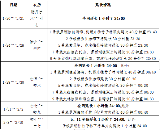 其中,1月24日至28日,1號線羅湖往前海灣、機場東往竹子林方向延長運營至23:40。2號線新秀往赤灣方向,5號線黃貝嶺往長嶺陂方向、赤灣往長嶺陂方向,7號線太安往安托山方向、西麗湖往深云方向,9號線文錦往深圳灣公園方向、前灣往孖嶺方向均延長運營至23:30。而2月3日至2月10日,地鐵5、11號線全線,以及1號線羅湖往竹子林方向還將延長運營至24:00。