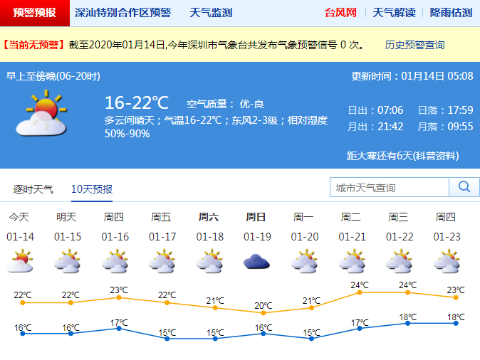 見圳客戶端·深圳新聞網(wǎng)2020年1月14日訊 深圳市氣象局預計14-15日多云為主,14日氣溫15-22℃;16日多云轉陰天,偶有零星小雨;17-19日冷空氣影響,多云到陰天,氣溫下降2-3℃,早晚較涼;20日起氣溫逐日回升。