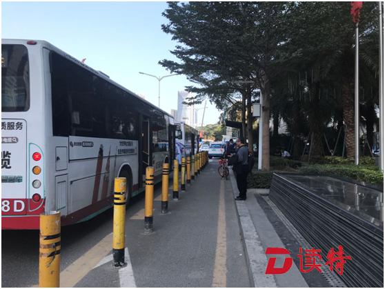 ▲1月14日下午,記者拍攝的深南大道南側(cè)崗廈北地鐵站②公交站,被隔離樁隔離處的人行道非常狹窄,給行人、自行車和上下公交車的乘客都帶來(lái)不便。