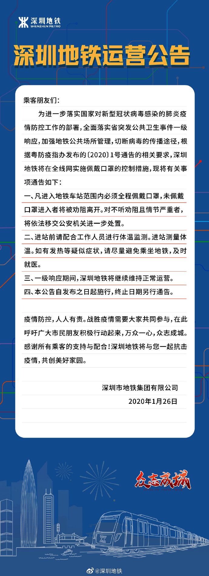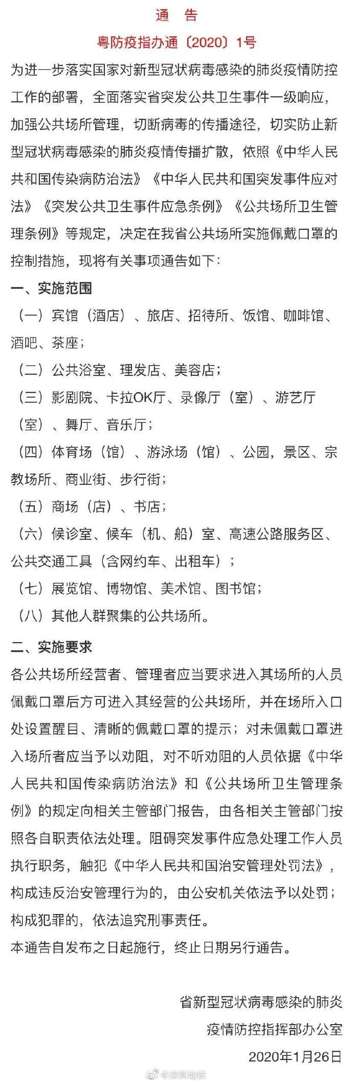 見圳客戶端·深圳新聞網(wǎng)2020年1月27日訊 深圳地鐵官方微博1月26日發(fā)布運營公告:根據(jù)粵防疫指辦發(fā)布的〔2020〕1號通告的相關(guān)要求,為全面落實省突發(fā)公共衛(wèi)生事件一級響應(yīng),加強地鐵公共場所管理,切斷病毒的傳播途徑,即日起,凡進(jìn)入地鐵車范圍內(nèi)必須全程佩戴口罩,未佩戴口罩進(jìn)入者將被勸阻離開。對不聽勸阻且情節(jié)嚴(yán)重者,將依法移交公安機關(guān)進(jìn)一步處置。