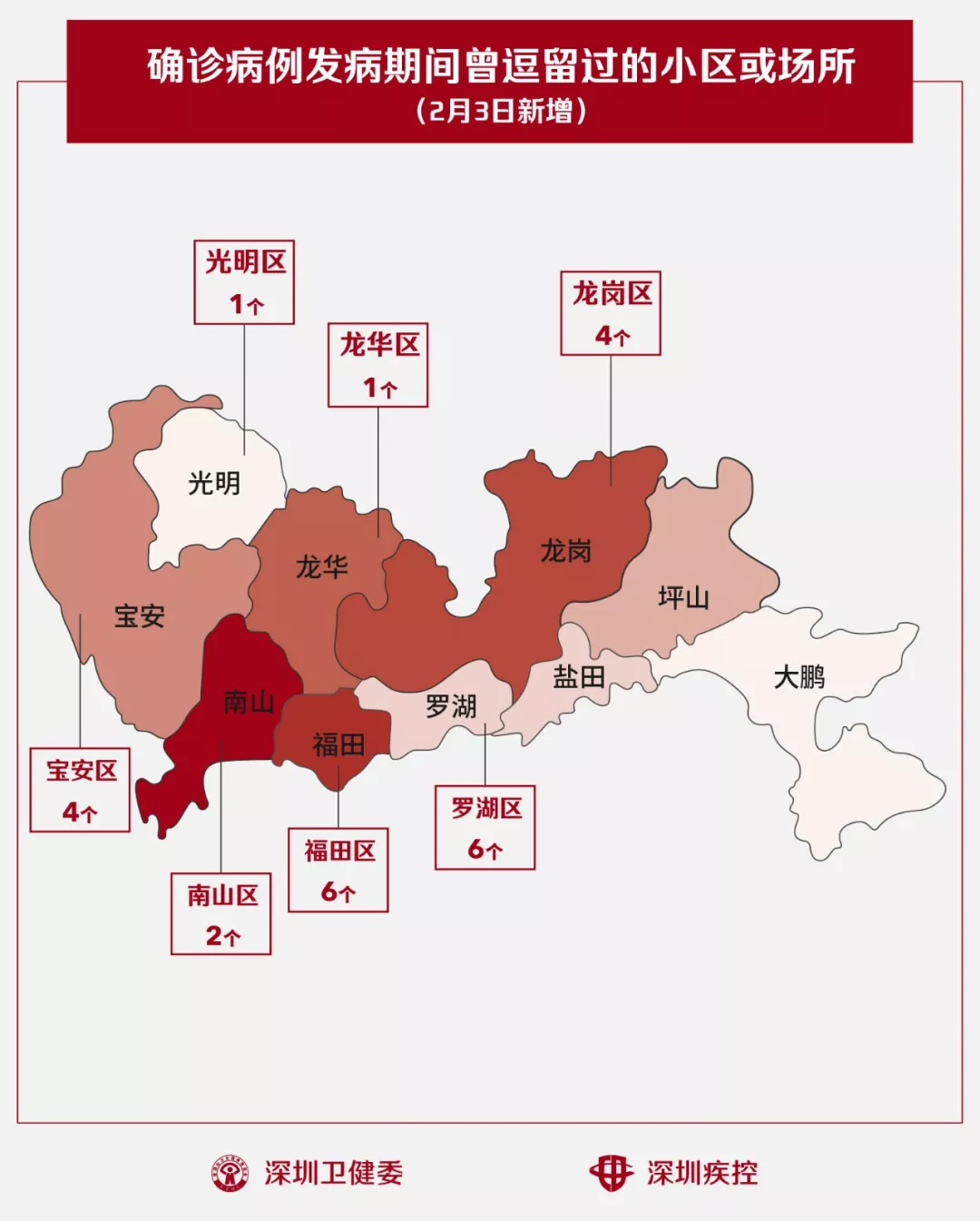 2月3日,疾控專業(yè)人員通過最新的流行病學(xué)調(diào)查確認(rèn),深圳新增24個(gè)小區(qū)(場所),有新確診的病人在出現(xiàn)病征期間曾經(jīng)逗留。