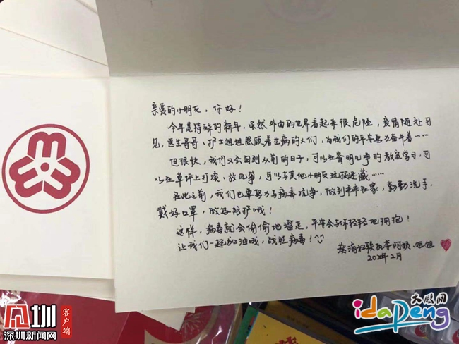 除了疫情防護(hù)的必需品,記者在這份暖心的“抗疫禮包”中還發(fā)現(xiàn)了一封字跡工整的信。信中寫道:親愛的小朋友,你好!今年是特殊的新年,雖然外面的世界看起來很危險,疫情隨處可見,醫(yī)生哥哥、護(hù)士姐姐照顧著生病的人們,為我們的平安努力奮斗著,但很快,我們又會回到從前的日子……劉贊告訴記者,這些漂亮的字跡出自她的同事肖可之手,雖然沒能跟姐妹們一起慰問,但肖可還是希望能盡自己的一份力,讓這份禮包更加溫暖,讓孩子們更加快樂開心。