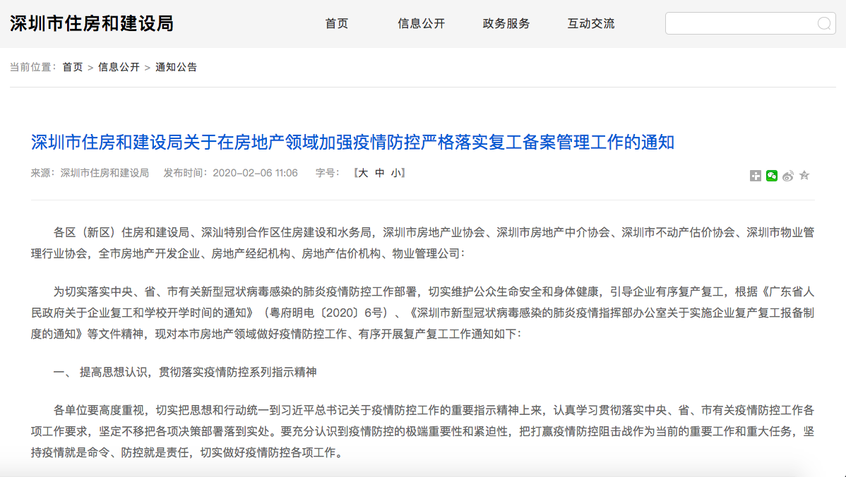 見圳客戶端·深圳新聞網(wǎng)2020年2月6日訊(見圳客戶端、深圳新聞網(wǎng)記者 潘潤華 通訊員 雷湘君)2月6日,深圳市住建局在其官網(wǎng)發(fā)布通知指出,在全省啟動重大突發(fā)公共衛(wèi)生事件一級響應期間,暫停房地產(chǎn)項目現(xiàn)場開盤活動,暫停房地產(chǎn)中介線下帶看房活動(企業(yè)自持物業(yè)出租除外),暫停疫情重點地區(qū)現(xiàn)場評估業(yè)務活動。此外,各物業(yè)管理公司應加強人員管理,暫停經(jīng)紀人員帶客進入小區(qū)看房活動。具體恢復時間另行通知。