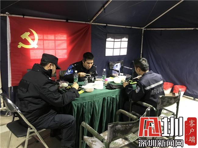 大鵬公安分局機訓(xùn)大隊的隊員們在帳篷內(nèi)用午餐