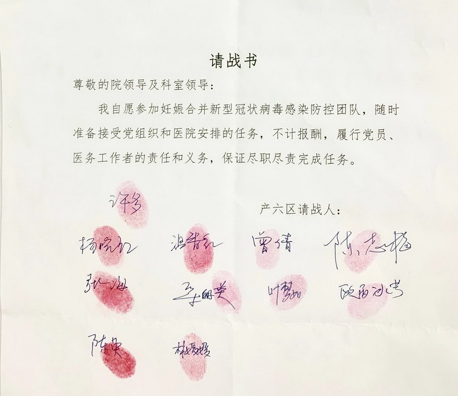 面對疫情,黨員干部紛紛向科室提交請戰(zhàn)書并莊嚴(yán)宣誓,志愿參加疫情防控的阻擊戰(zhàn)。產(chǎn)科共收到200多份請戰(zhàn)書,特別是有三名孕婦請纓,令人動容。請戰(zhàn)人員組成了三個防控梯隊,為醫(yī)院妊娠合并新型冠狀病毒感染防控奠定了強大的人力資源保障。