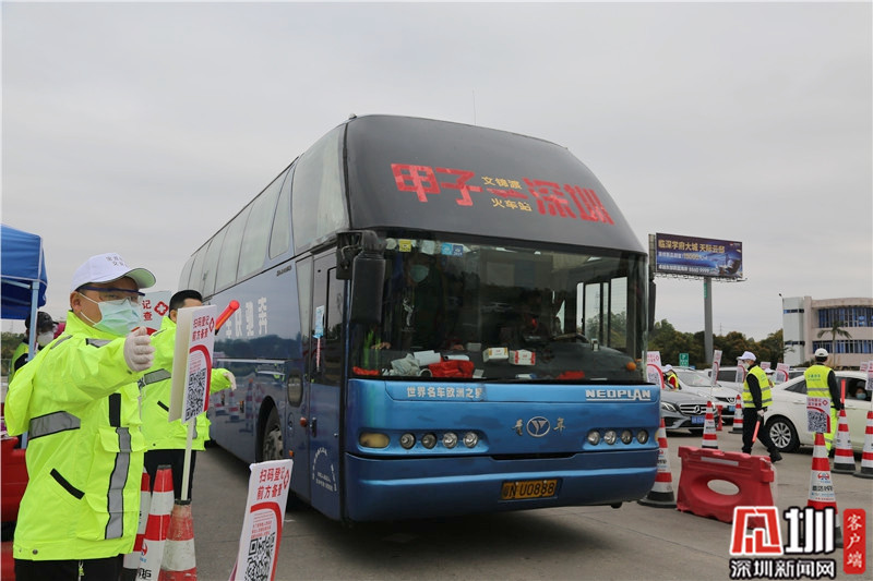 大巴車到來時,工作變得復(fù)雜了些,不僅需要引導(dǎo)車上所有人員有序下車、依次接受檢驗檢疫,遇到?jīng)]帶身份證的乘客,還要帶他們到現(xiàn)場公安處核查身份。如有湖北籍乘客,還需提示其到復(fù)檢區(qū)登記信息。