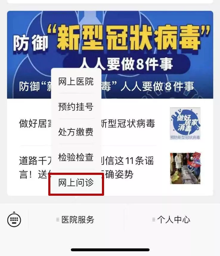 ①關(guān)注“深圳羅湖區(qū)人民醫(yī)院”的公眾號,點擊左下角菜單“醫(yī)院服務”→“網(wǎng)上問診”