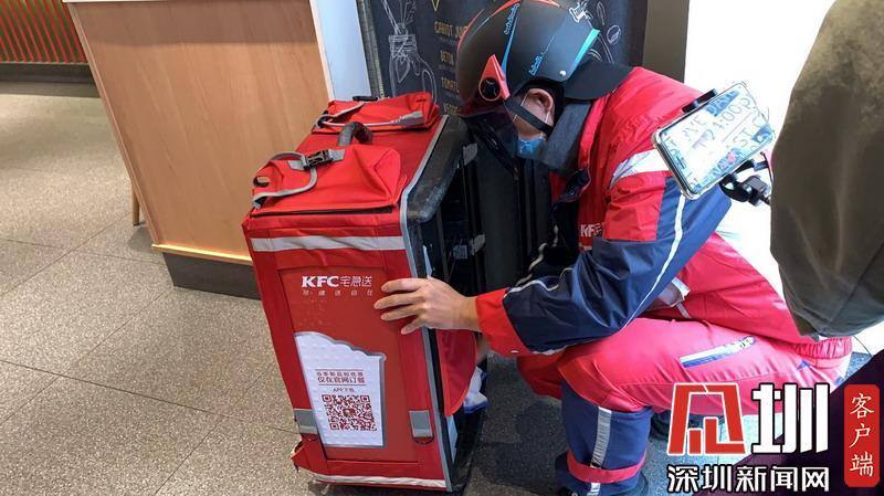 集體用餐配送服務平臺的餐飲企業(yè)——肯德基,外賣小哥每次送餐后均對外賣柜子進行消毒。