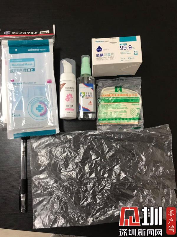 復(fù)工佩戴的物品:口罩、一次性手套、酒精消毒片、一支帶筆蓋的筆、工牌、手機都套塑料袋