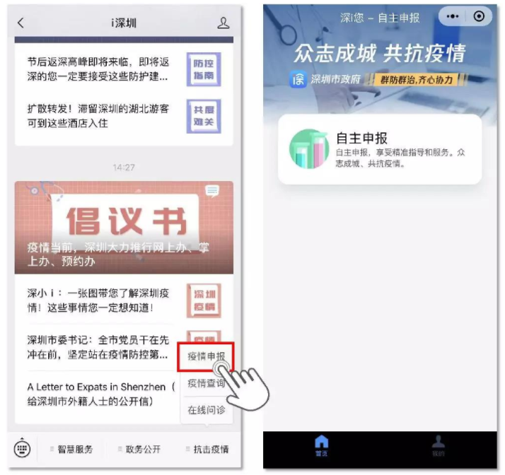 3、“i深圳”APP:通過(guò)“i深圳”APP疫情防控服務(wù)專區(qū)入口,進(jìn)入申報(bào)平臺(tái)。