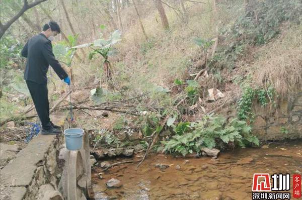 工作人員對飲用水源支流水質(zhì)進(jìn)行采樣。