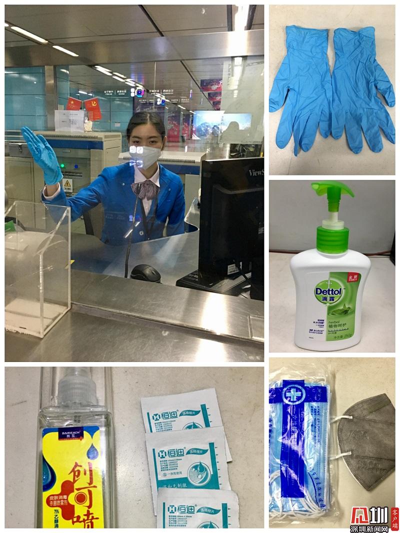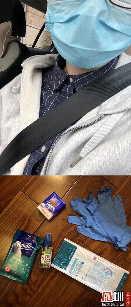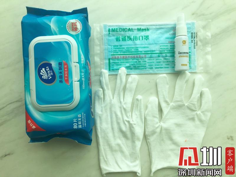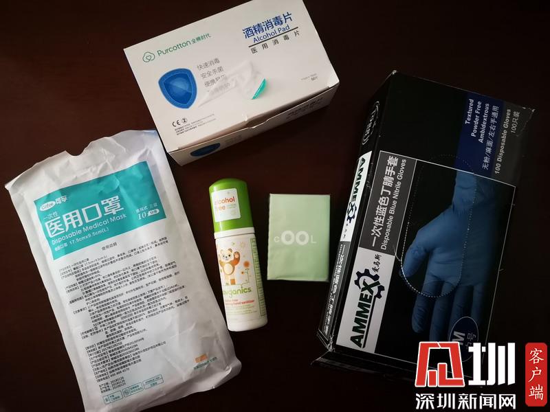 家住福田,在羅湖上班的丘小姐今天也開始了他的復(fù)工第一天,為了在路上做好防護,她準備了一次性雨衣、鞋套、手套及眼鏡,當然口罩必不可少,她還隨身攜帶了含有酒精的免洗洗手液,以備接觸了可疑物品之后能馬上自我消毒。