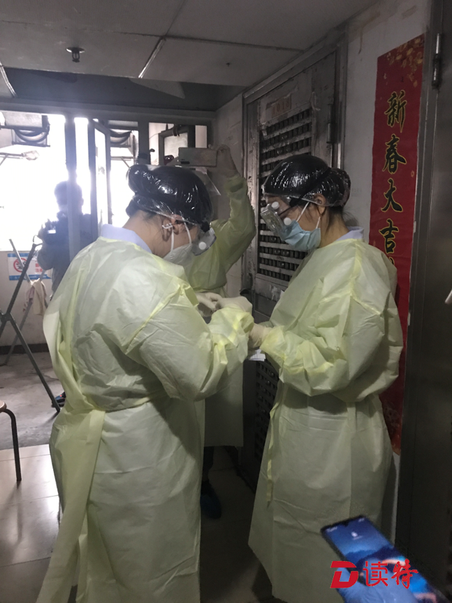 孫女士打開門,將工作人員遞進(jìn)去的防護(hù)裝備穿戴完畢?!盀榱吮Wo(hù)醫(yī)護(hù)人員的安全,減少交叉感染的可能性,所有的上門檢測都會(huì)在樓道里進(jìn)行?!鄙缈抵行墓ぷ魅藛T說。提前穿好防隔服等防護(hù)裝備、拿檢測時(shí)給居民坐的凳子、為凳子消毒,開始進(jìn)行檢測前就需要做很細(xì)致的準(zhǔn)備工作。