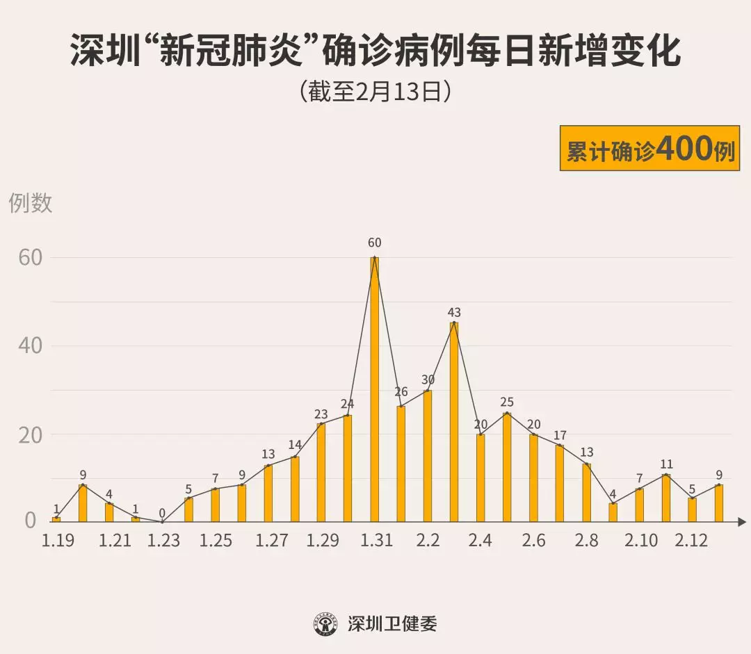 截至2月13日24時(shí),深圳累計(jì)報(bào)告“新冠肺炎”確診病例400例。2月13日當(dāng)天全市新增確診病例9例(個(gè)案詳情今晚公布)。