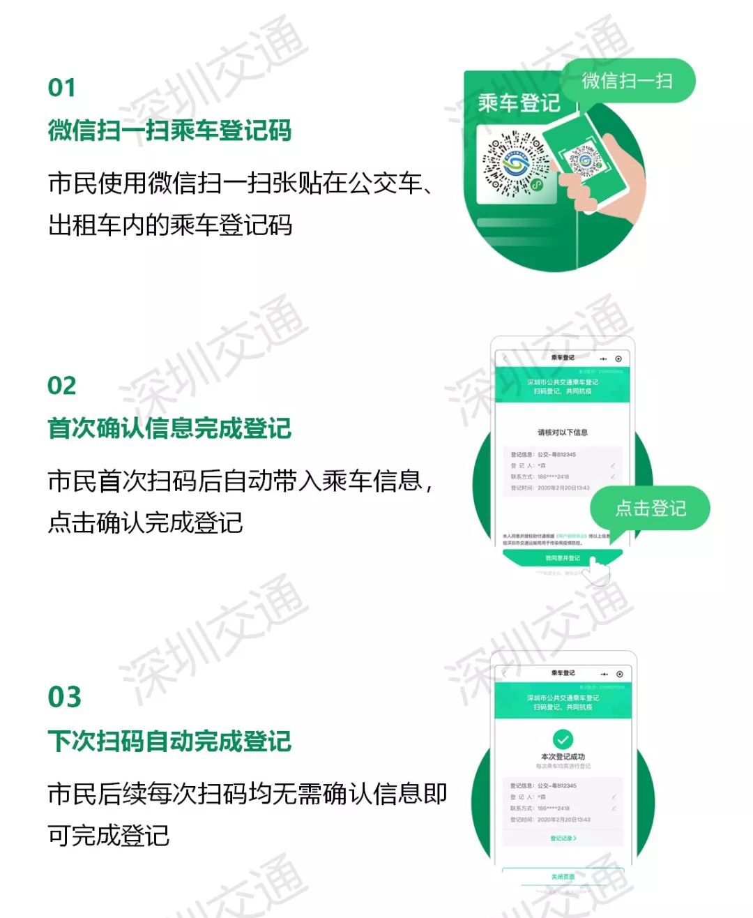 一、市民乘車時(shí)請(qǐng)主動(dòng)按照操作指引,通過(guò)車輛上的乘車登記二維碼登記乘車信息。