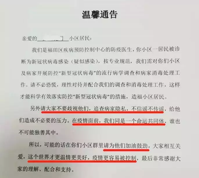 “疫情面前,我們同是一個(gè)命運(yùn)共同體”“大家相互關(guān)愛(ài),這個(gè)世界才更溫情美好,疫情更容易被控制……”1月30日,位于深圳福田區(qū)的一小區(qū)出現(xiàn)新冠肺炎疑似感染病例,福田區(qū)疾病預(yù)防控制中心的防疫醫(yī)生隨即發(fā)布了這則通告,瞬間刷屏了深圳人的朋友圈。通告除了呼吁小區(qū)居民配合調(diào)查及消毒處理工作外,還特地懇請(qǐng)大家“不要歧視,在疫情面前,我們是同一個(gè)命運(yùn)共同體,誰(shuí)也不可能獨(dú)善其身?!绷攘葦?shù)字的“請(qǐng)求”,感動(dòng)無(wú)數(shù)人。